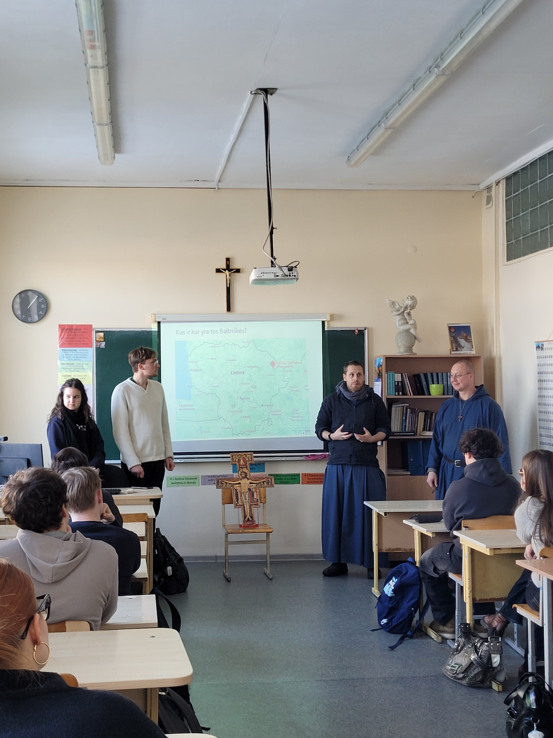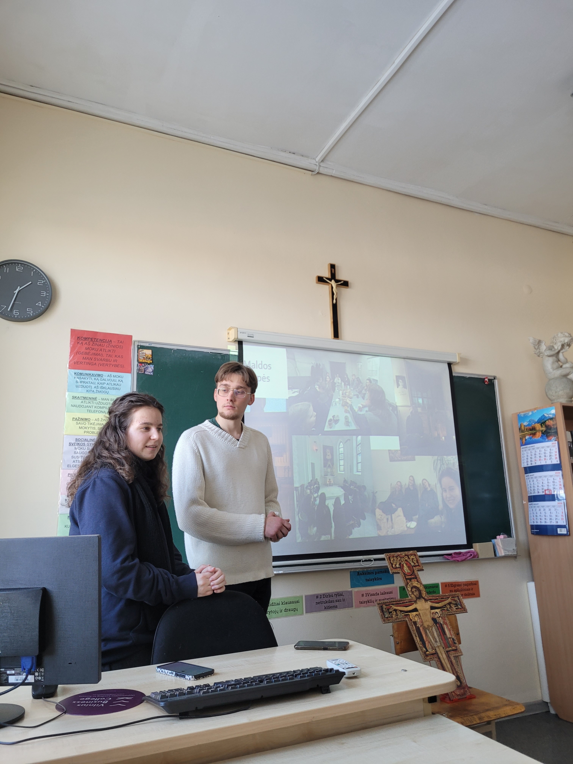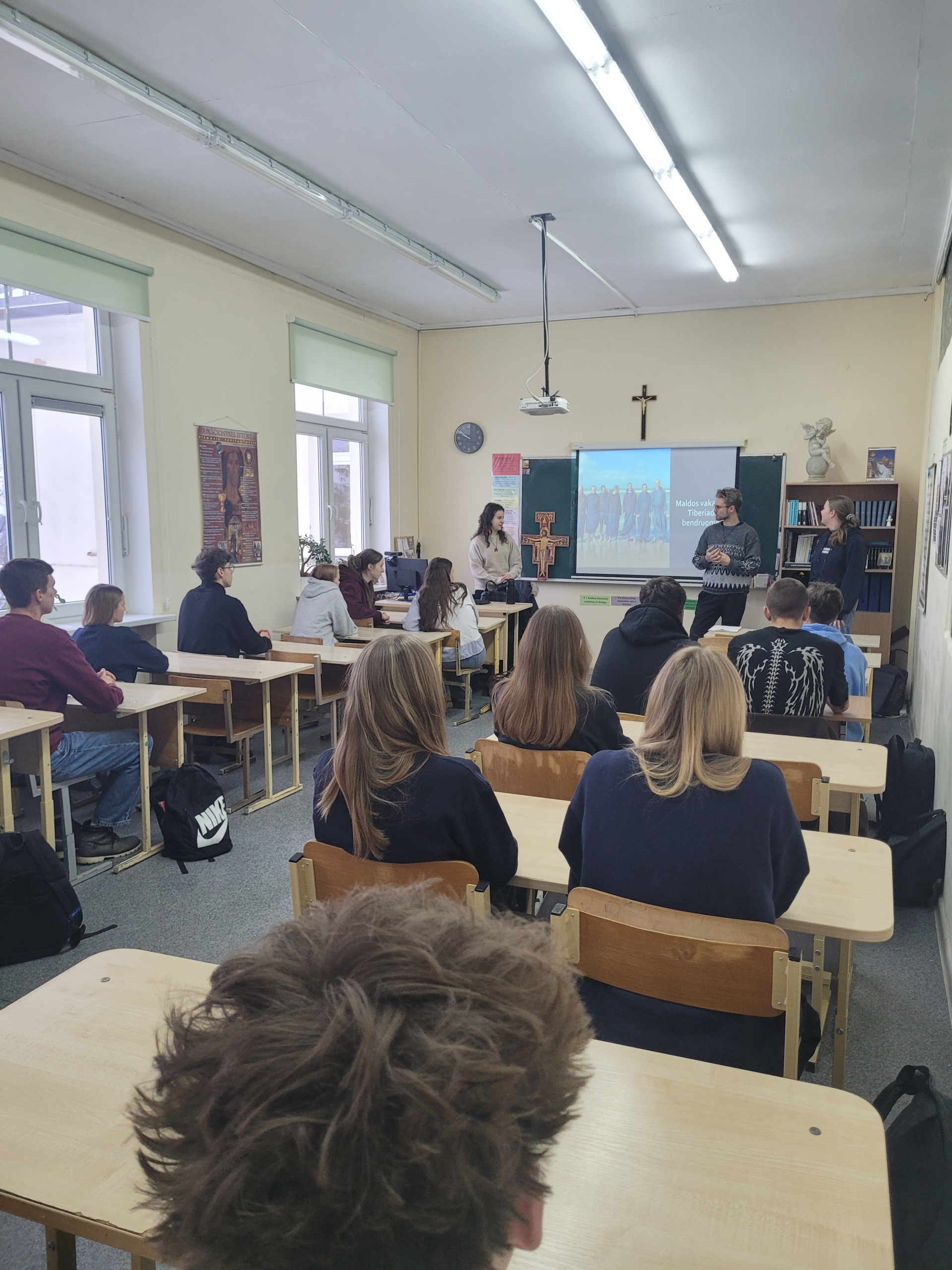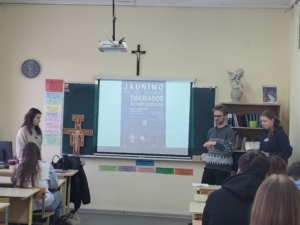 Sausio mėnesio pabaiga mūsų gimnazijai buvo ypatinga. Šiais mokslo metais mūsų gimnaziją jau antrą kartą aplanko vienuolinio gyvenimo atstovai. Šįkart mus aplankė Tiberiados bendruomenės nariai: studentai, prisidedantys prie bendruomenės veiklų ir gyvenimo, bei patys broliai Jonas iš Latvijos ir Joakimas iš Belgijos. Pirmadienį studentai, priklausantys „San Damiano“ maldos grupelėms, pasakojo apie savo tapimą bendruomenės dalimi ir veiklas šioje bendruomenėje, o penktadienį mokiniai turėjo galimybę pažinti pačius brolius vienuolius ir jų kelio atradimo istorijas. Susitikimai buvo ypatingi, kalbantys ir tikintiems, ir netikintiems. O svarbiausia, kad mokiniai buvo kviečiami į maldos vakarą, kuris vyks vasario 21 d. Šv. Ignaco Lojolos bažnyčioje. Broliai priminė, kad gyvenimas ir kiekviena diena yra kaip dovana. Kad būti bendruomenėje yra svarbu dėl to, kad galėtume padaryti gyvenime daugiau ir geriau. Brolis Joakimas uždavė klausimą: kaip, mūsų manymu, mus mato Dievas? Mes galvojame, kad Dievas mus mato kaip nuodėmingus, pasimetusius, kenčiančius, laimingus, džiugius. Jis pasidalino savo žvilgsniu, kad Dievas mus mato kaip mama ar tėtis ką tik gimusį savo kūdikį – kupinu meilės ir džiaugsmo žvilgsniu, ir tai nuostabus jausmas. Taip pat priminė, kad svarbu suprasti, jog mumyse yra pats Dievas, pats svarbiausias šaltinis, gyvenantis mumyse. Tik mes patys turime atsirinkti, kas gi mums yra svarbiausia. Pirmieji susitikimai su šios bendruomenės nariais tikrai buvo labai ypatingi; kalbėjome, jog jie pirmi, ir tikėkimės, jog ne paskutiniai. Nuoširdi padėka skrieja šiaulietei Rugilei Ramoškaitei už šios idėjos atradimą ir drąsą ją įgyvendinti bei Šiaulių jaunimo budinimą tikėjime.