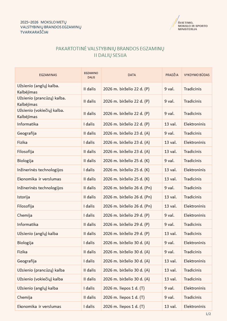 Švietimo, mokslo ir sporto ministrė Raminta Popovienė patvirtino 2025–2026 m. m. valstybinių brandos egzaminų (VBE) tvarkaraščius.