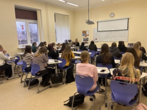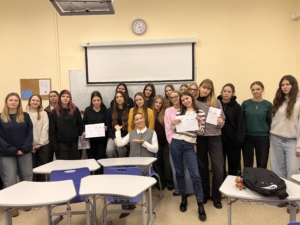 Didžiausias pamokų akcentas – praktinė demonstracija, kuriai reikėjo tvarkingos, dailios mokinės, galinčios tapti modeliuku. Džiaugiamės, kad pavyko rasti puikią savanorę –Oliviją Petrikaitę, kuri drąsiai sutiko dalyvauti profesionalios visažistės kuriamame makiaže.