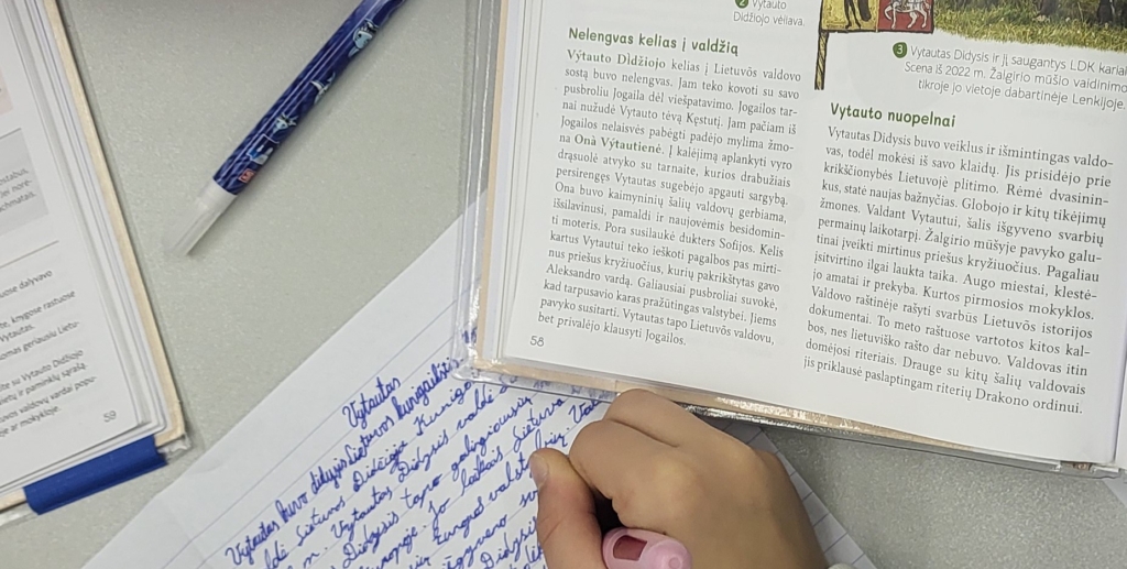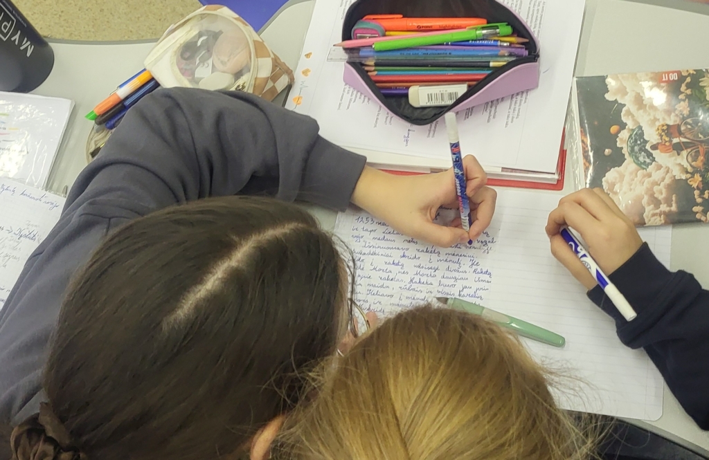 Gruodžio 12 dieną 5 klasės mokiniams vyko netradicinė – integruota istorijos ir lietuvių kalbos pamoka „Iš dainos į pasaką“. Mokiniams pamokos pradžia buvo kiek netikėta – ji prasidėjo muzikiniu kūriniu „Lietuvos istorijos repas“. Mokiniai, išklausę dainos, pradėjo istorinių faktų medžioklę: dirbdami grupėmis, atspausdintame dainos tekste ieškojo istorinių faktų, aptartų istorijos pamokose – aiškino, kaip rasti faktai siejasi su tikra Lietuvos istorija. Po šios veiklos mokiniams teko tapti gimtosios kalbos ekspertais – tekste braukė barbarizmus, netaisyklingus žodžius, junginius, juos pakeitė lietuvių kalbos atitikmenimis. Atlikę šias užduotis mokiniai ėmėsi kurti Lietuvos istorijos pasaką, panaudodami žinomus istorinius faktus – kiekviena grupelė pristatė savo grožinį tekstą klasės draugams.