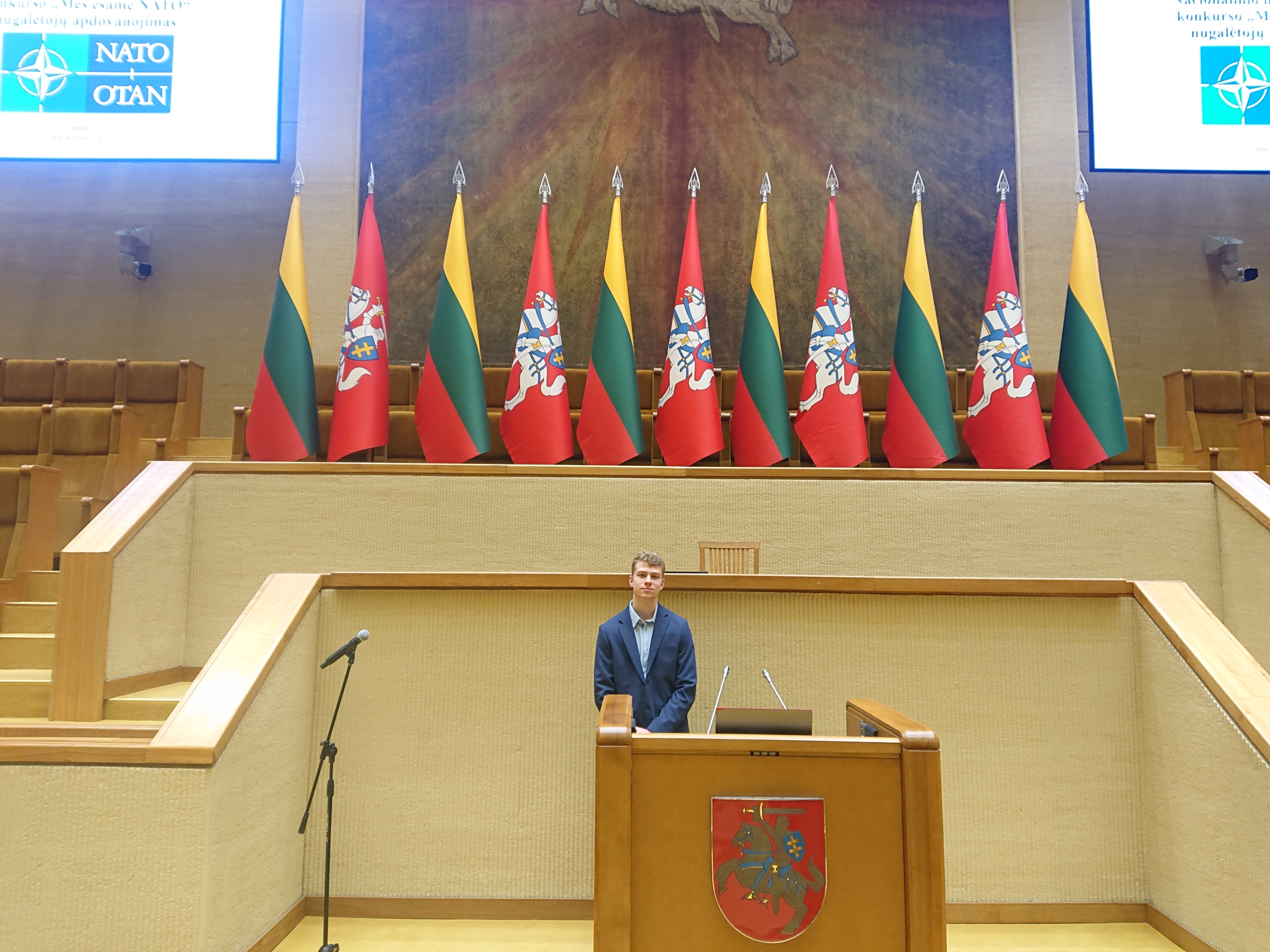 Kovo 27 dieną IIIi1 klasės mokinys Nikolas Vaišvilas vyko į Vilnių, kur dalyvavo baigiamajame rašinių konkurso „Mes esame NATO“ renginyje. Iškilminga apdovanojimų ceremonija vyko Lietuvos Respublikos Seimo istorinėje Kovo 11-osios salėje, kur buvo pagerbti nacionalinio moksleivių konkurso dalyviai ir nugalėtojai. Šiemet jau aštuntą kartą organizuotas konkursas sulaukė rekordinio dalyvių skaičiaus – darbus pateikė daugiau nei 400 moksleivių.