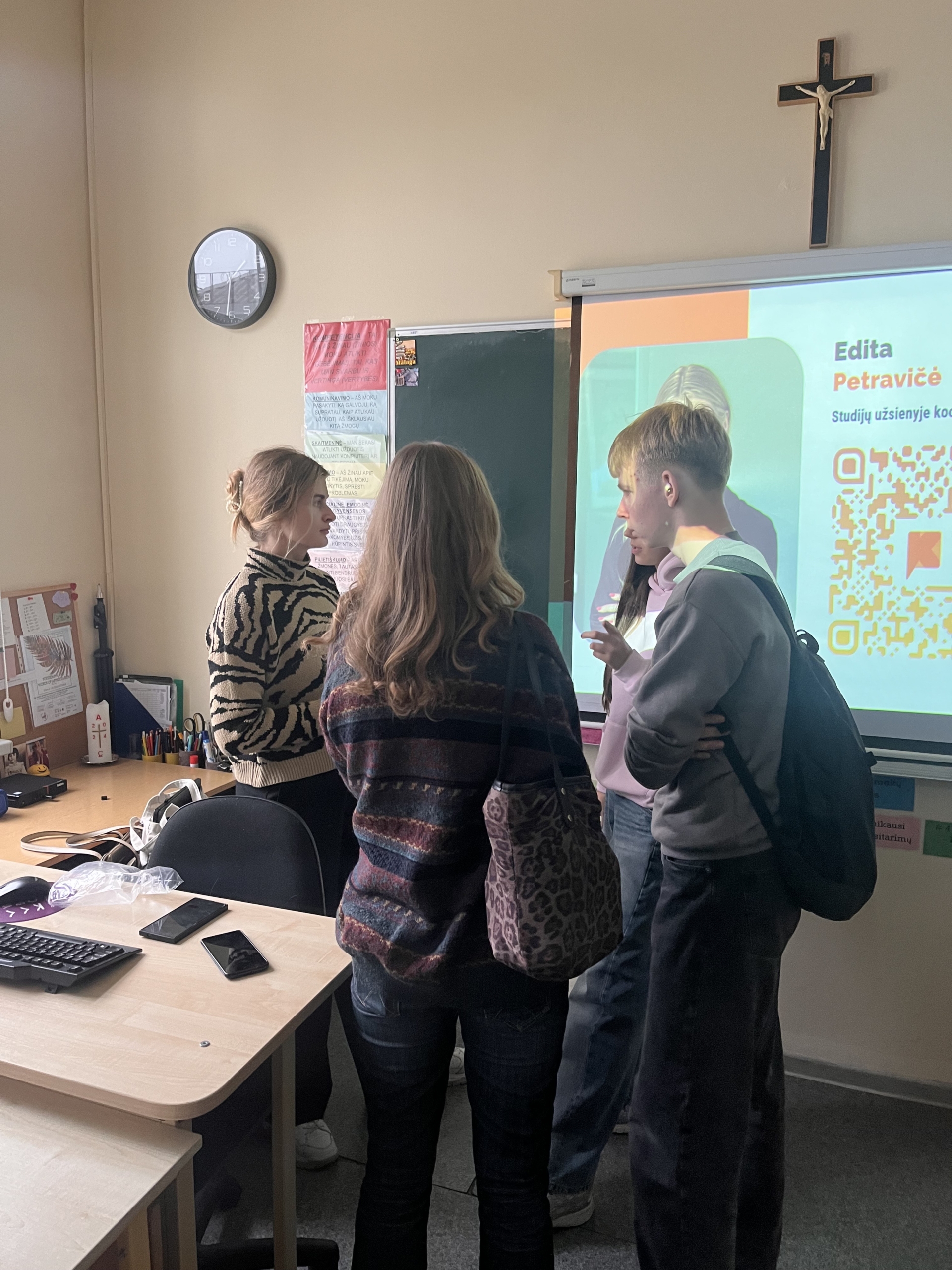 Po pristatymo mokiniai aktyviai uždavinėjo klausimus: domėjosi stojimo tvarka, pasirengimu egzaminams, kalbos reikalavimais, gyvenimo išlaidomis bei stipendijomis. E. Petravičė pasidalijo praktiniais patarimais, kaip tinkamai pasiruošti studijoms ir pasirinkti labiausiai individualius poreikius atitinkančią šalį bei programą.