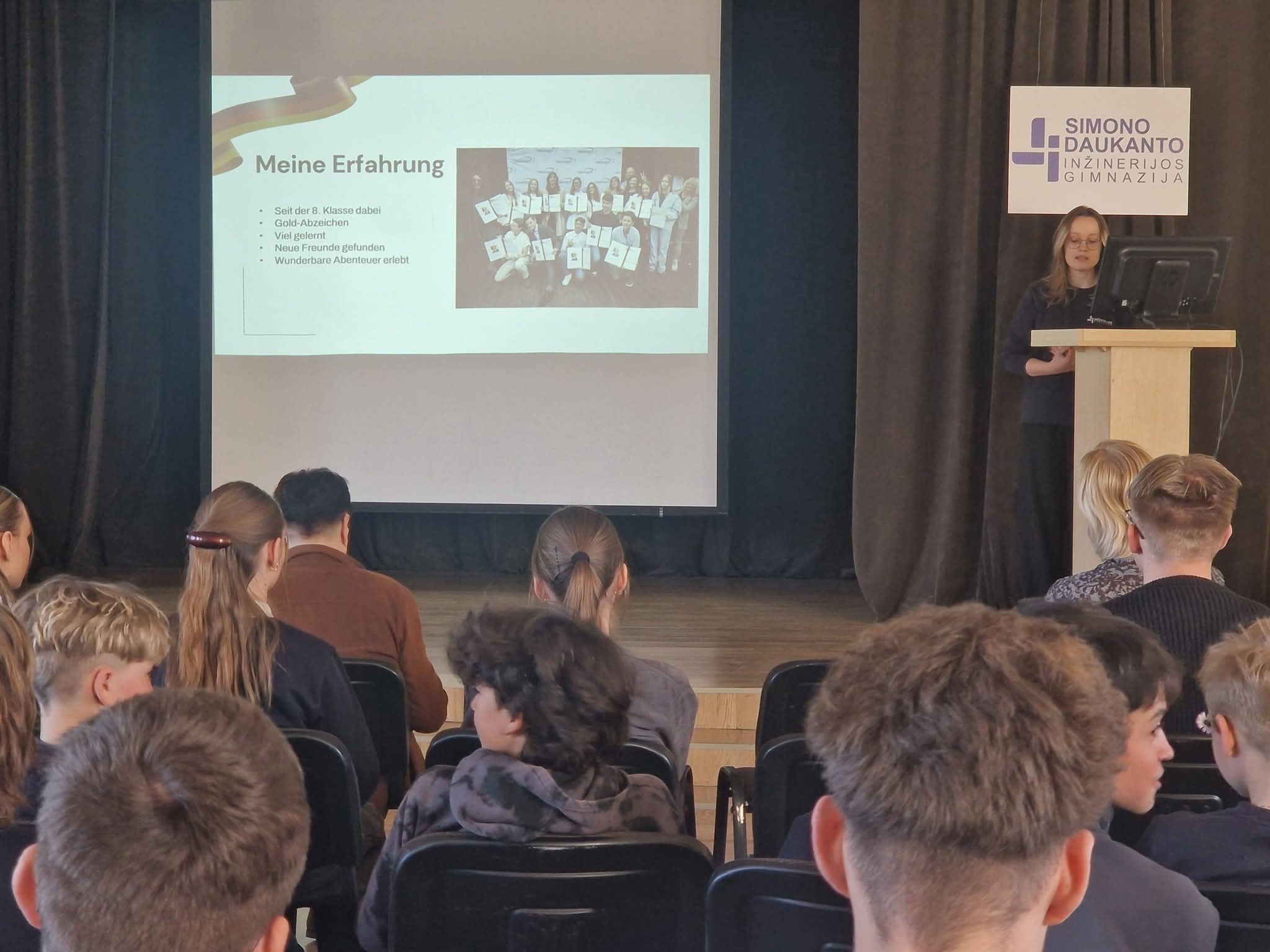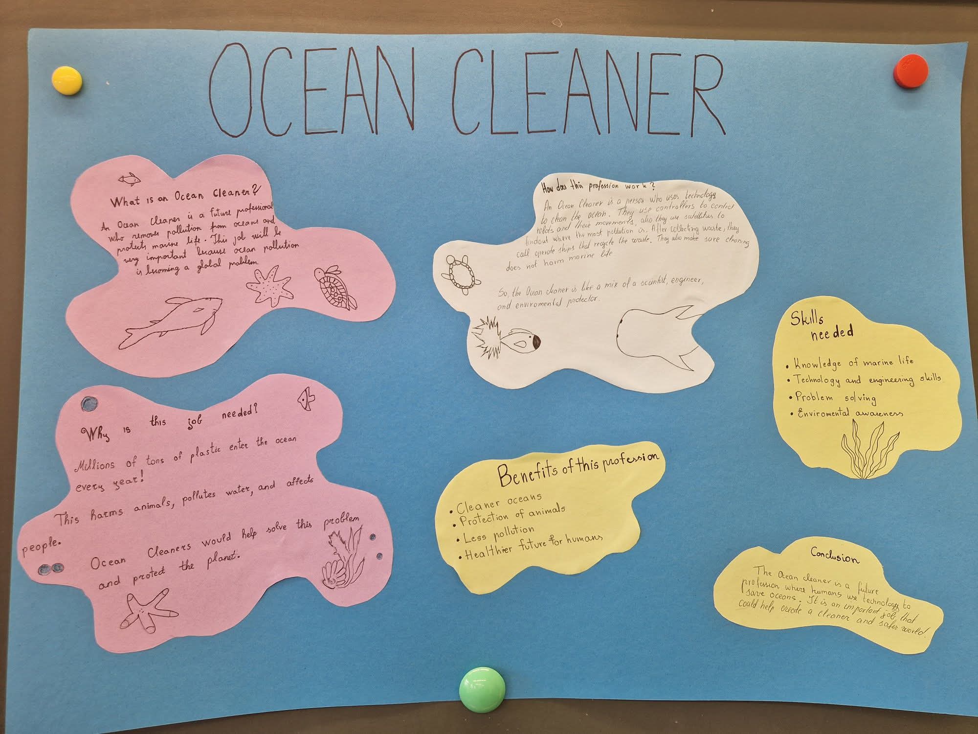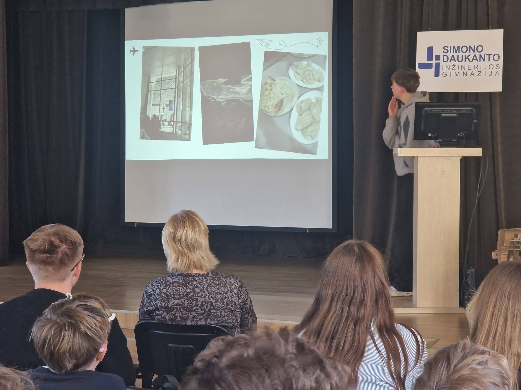 Anglų kalbos pamokų metu gimnazistai rengė ir pristatinėjo plakatus apie būsimas profesijas tarptautiniam konkursui „That’s Not Even a Real Job!“. Tai skatino kūrybiškumą, kritinį mąstymą ir gebėjimą pristatyti idėjas užsienio kalba.